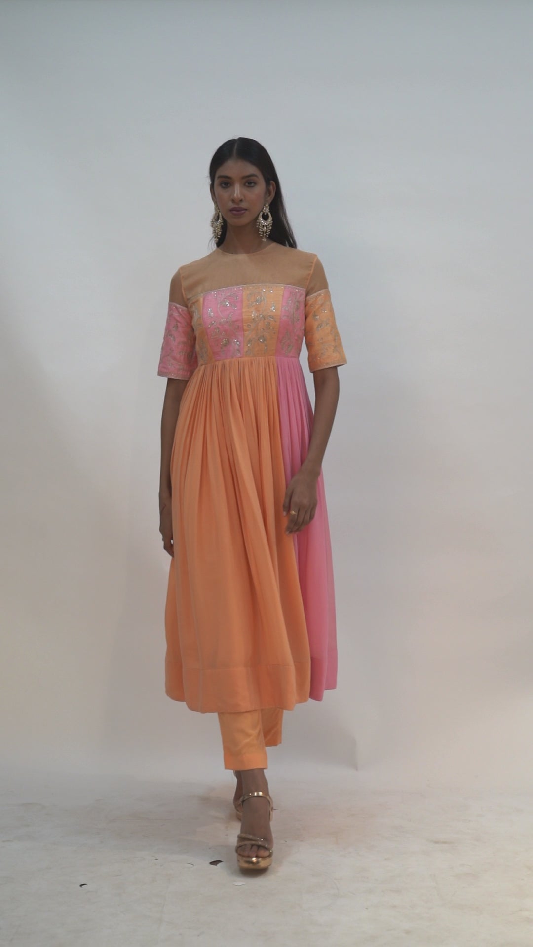 Rawsilk yoke with zari embroidered gathered dress paired with cotton silk straight pants.