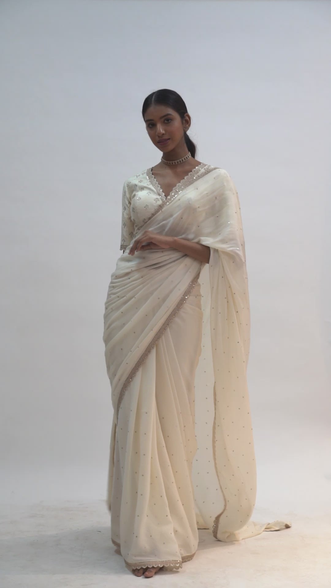 Hand embroidered zari and sequence embroidered crepe saree with embroidered rawsilk blouse.