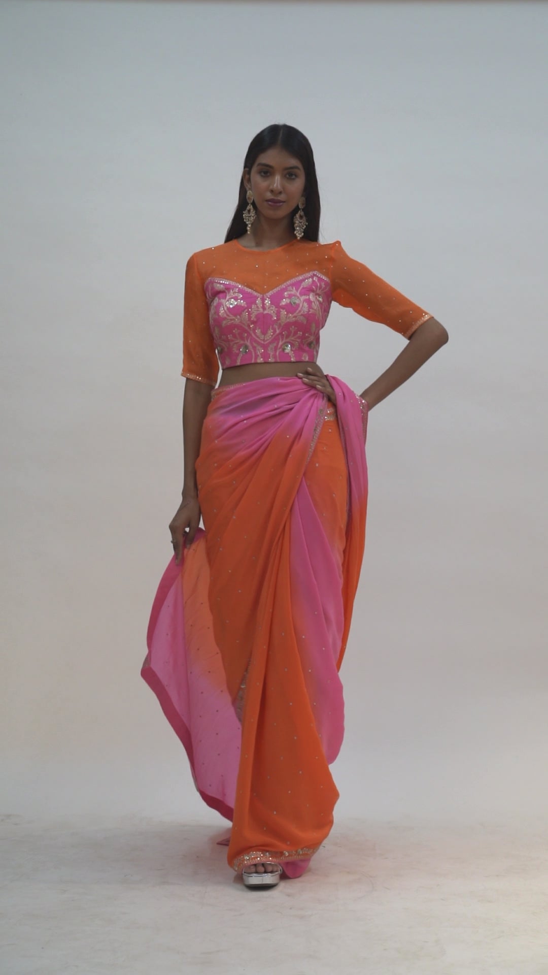 Hand embroidered zari and sequence embroidered double shaded crepe saree with embroidered rawsilk embroidered blouse.
